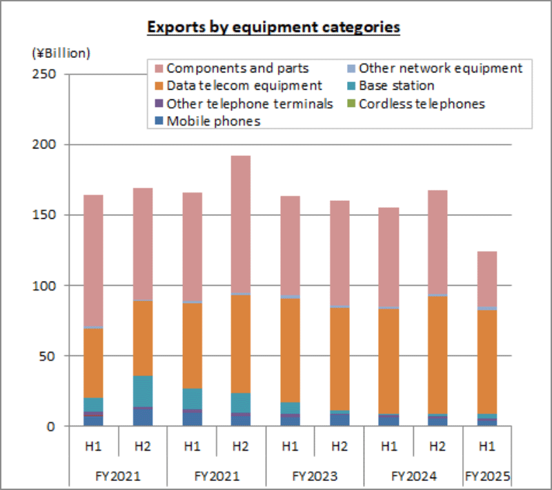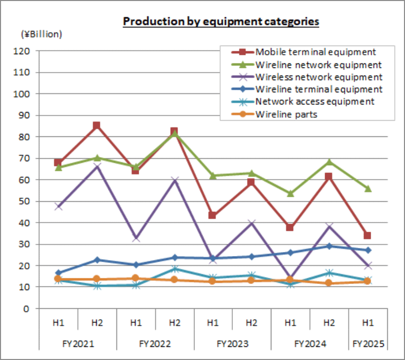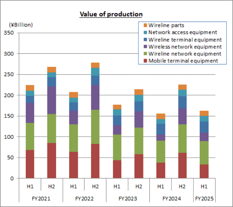 Domestic production value for the first half of fiscal year 2025 reached ¥162.3 billion, a 4.4% increase compared to the same period last year. Domestic production grew as all product categories—transportation equipment (including digital transmission equipment), fixed communication equipment, base station communication equipment, and network connection equipment—performed steadily. Fixed communication equipment saw growth due to infrastructure development by local governments for disaster prevention and recovery measures. Network connection equipment increased driven by the expansion of communication networks to meet the demand for high-capacity, high-speed transmission, fueled by the widespread adoption of cloud services and web conferencing, the expansion of services utilizing generative AI, and the establishment and expansion of data centers.