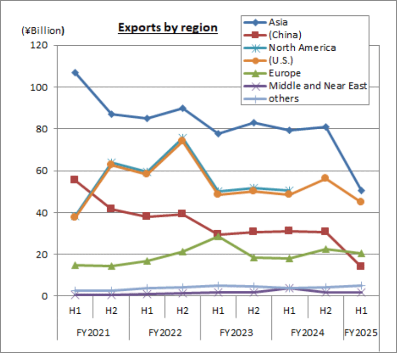 Total exports for the first half of fiscal year 2025 amounted to ¥124 billion, a 20.3% decrease compared to the same period last year. Exports of parts to Asia fell by 36.2%, with exports to China dropping by 55.1%. This decline is attributed to sluggish demand in China’s domestic smartphone market and China’s accelerated push toward domestic production of semiconductors and electronic components amid prolonged U.S.-China tensions. Changes in production patterns within China are likely impacting Japan’s supply chains.