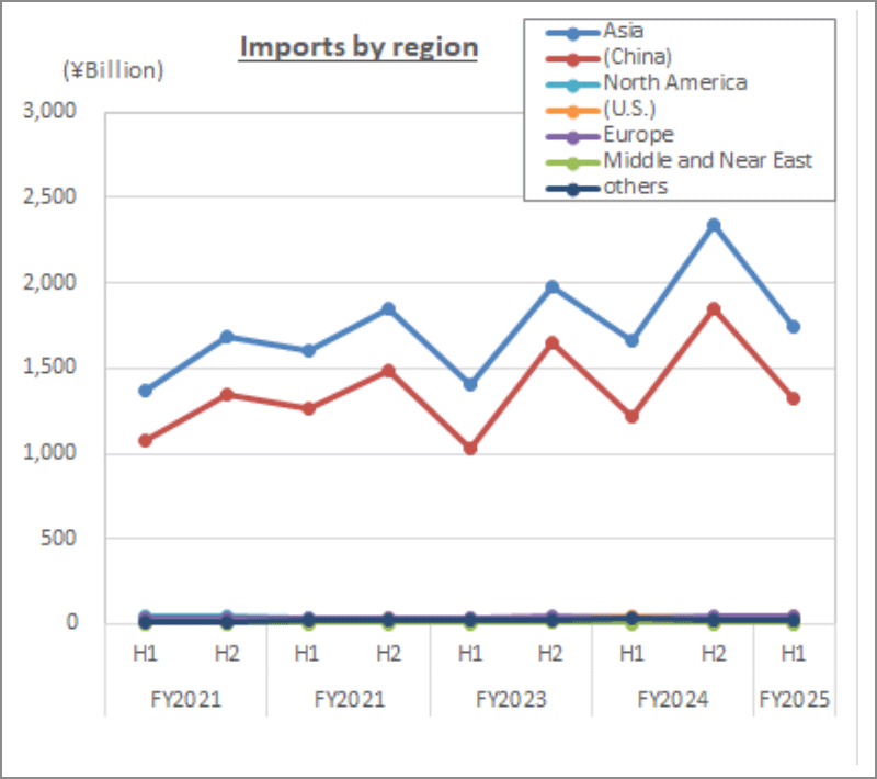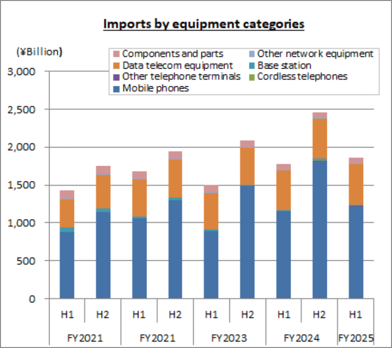 Total imports for the first half of fiscal year 2025 reached ¥1.8546 trillion, a 4.5% increase compared to the same period last year. This growth was driven by continued strong demand for overseas-manufactured smartphones, coupled with the rise of foreign vendors supplying infrastructure for domestic network expansion and data center construction.