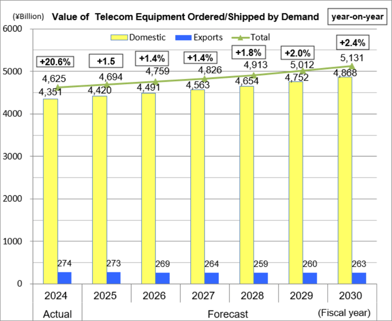 The total value of the telecommunications equipment market in fiscal year 2030 is projected to be ¥5,130.7 billion (a 10.9% increase compared to fiscal year 2024, CAGR 1.7%), with domestic sales amounting to ¥4,867.6 billion (an 11.9% increase, CAGR 1.9%) and exports totaling ¥263.0 billion (a 4.0% decrease, CAGR -0.7%).