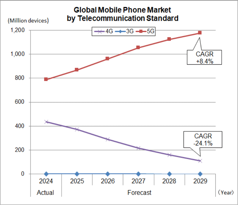 - The global mobile phone market (including smartphones) is seeing 5G service adoption primarily in developed countries, with 5G services expected to expand more widely after 2025. By communication standard, the market for 5G-capable smartphones is expected to expand, as most future smartphones are projected to support 5G. Conversely, the market for non-5G smartphones is forecast to shrink. While some migration demand from 3G will persist, the rapid replacement with 5G devices is accelerating this decline.