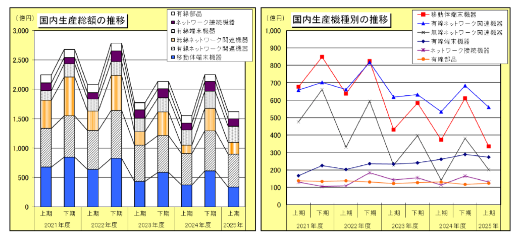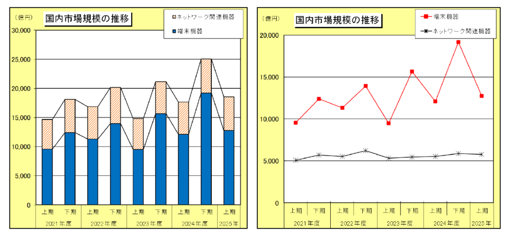 2025年度上期の国内市場規模は1兆8,547億円、前年同期比では5.1%増となりました。海外メーカー製スマートフォンの輸入拡大基調は変わらず、国内生産はネットワーク関連機器が増産され、国内市場規模は増加しました。