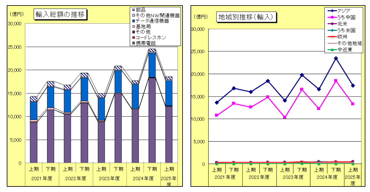 2025年度上期の輸入総額は1兆8,546億円、前年同期比では4.5%増となりました。海外製スマートフォンの旺盛な需要継続に加えて、国内のネットワーク拡張とデータセンター建設向けインフラ整備にも海外ベンダーが台頭し、輸入総額は増加しました。
